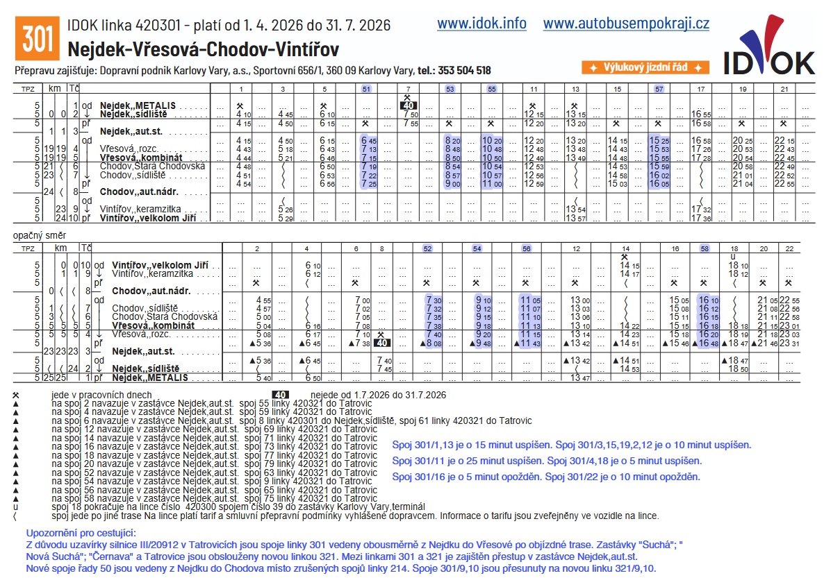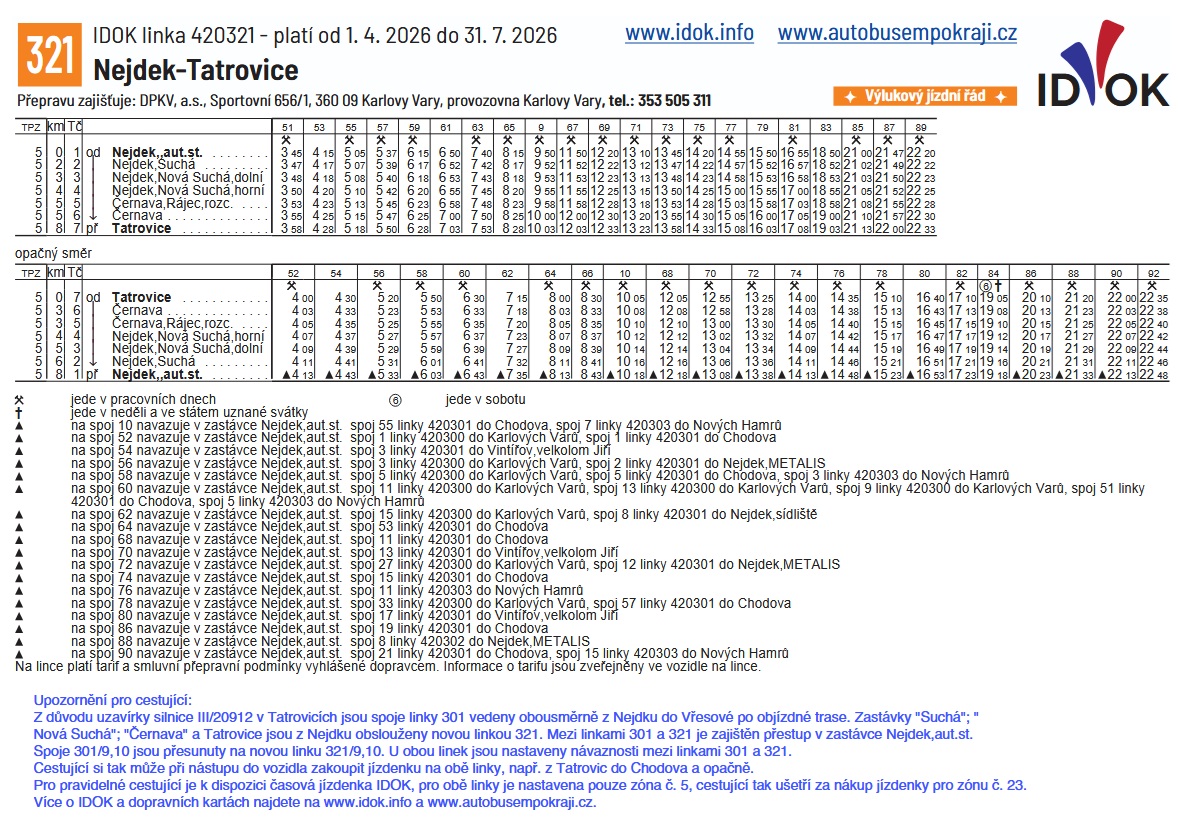 Přestupy: Mezi linkami 301 a 321 je zajištěn navazující přestup v zastávce Nejdek, aut. st.