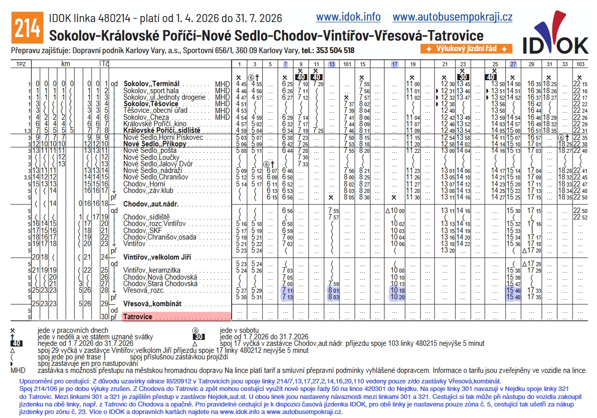 Vážení spoluobčané, z důvodu úplné uzavírky silnice III/20912 v úseku Tatrovice – Vřesová dochází od 1. 4. 2026 k výrazným změnám v jízdních řádech linek 301, 321 a 214.Upozorňujeme, že termín zahájení uzavírky se může ještě o několik dní posunout v závislosti na postupu prací.