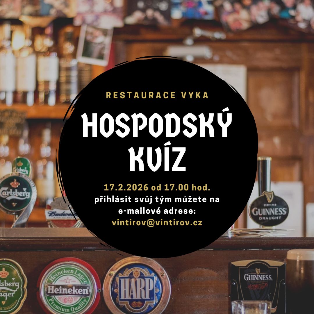 Zveme vás na týmovou vědomostní soutěž, která se bude konat 17.2.2026 od 17:00 hod. v restauraci Vyka u Petra Vystrčila. Přihlásit se může až 6 týmů, přičemž jeden tým tvoří 2-6 soutěžících. Přihlášky ZDARMA zasílejte od 19.1.2026 do 13.2.2026 nebo do naplnění kapacity na e-mail vintirov@vintirov.cz. Na akci bude pořizována fotodokumentace.